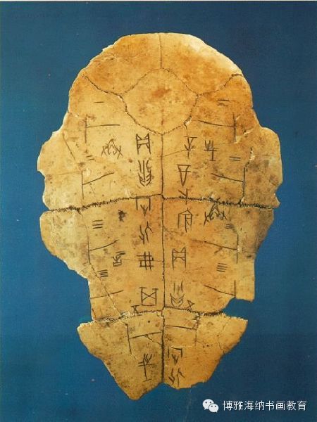 古汉字一种书体的名称,也是现存中国最古的文字,刻在甲骨上,先用於卜辞(殷代人用龟甲、兽骨占卜。占卜后把占卜时期、占卜者的名字、所占卜的事情用刀刻在卜兆的旁边,有的还把过若干日后的吉凶应验也刻上去。学者称这种记录为卜辞),是对未来事情结果的占卜,盛于殷商。甲骨文发现於1889年,是殷商晚期王室占卜时的记录,发现於河南省安阳小屯村一带,距今已3000多年。甲骨文是中国书法史上的第一块瑰宝,其笔法已有粗细、轻重、疾徐的变化,下笔轻而疾,行笔粗而重,收笔快而捷,具有一定的节奏感,笔划转折处方圆皆有,方者动峭,圆者柔润,其线条比陶文更为和谐流畅,为中国书法特有的线的艺术奠定了基调和韵律。甲骨文结体长方,奠定汉字的字型。甲骨文的结体随体异形,任其自然。其章法大小不一,方圆多异,长扁随形,错落多姿而又和谐统一。后人所谓参差错落、穿插避让、朝揖呼应、天覆地载等汉字书写原则,在甲骨文上已经大体具备。